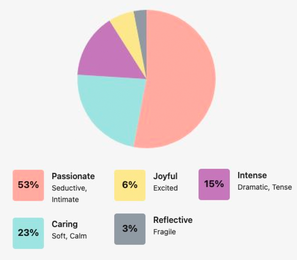 Amplifai analyzes music across six basic emotional features—Anger, Joy, Sensuality, Fear, Sadness, and Tenderness—along with two energetic features—Beat Impact and Tempo Feel.